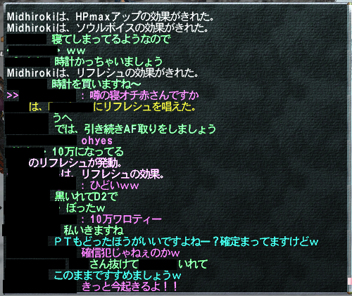 両手鎌欠片NMのところに到着。次はソウルボイスナイトル使って2PTにマチマチをまわし、いざ突撃。狩/侍の人がお亡くなりになったりしましたが、何とか無事に撃破。