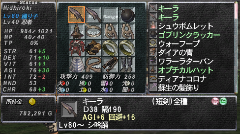 メリポで短剣スキル8ふり、回避スキルは4ふり、C・ポジションは5ふり。回避装備は白虎のときと変わらず。敵の命中が低いのか、矢印に装備を変更してもシュンシュン避けてました。
